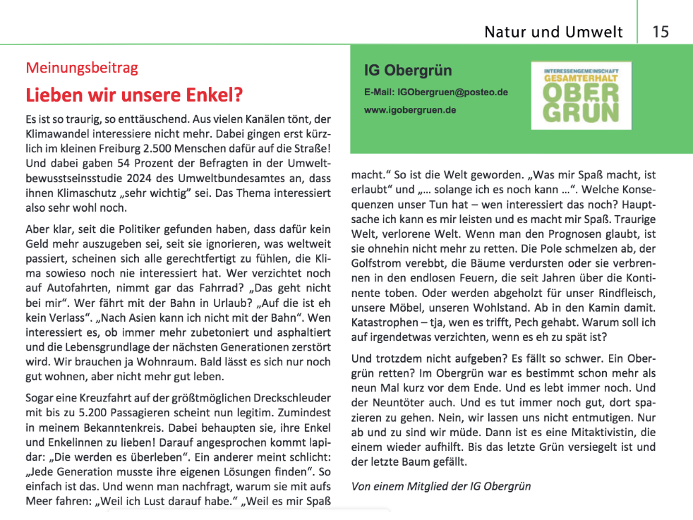 „Lieben wir unsere Enkel?“ fragen wir im Bürgerblättle Dez/Jan 2025/26 Beitrags-Autor:IGO Beitrag veröffentlicht:Dezember 30, 2025 Beitrags-Kategorie:Presseartikel Unser Handeln heute hat Folgen für die Welt von morgen – nur: Davon wollen viele nichts wissen … Wie das im Alltag so rüberkommt, schildert ein Mitglied der IG Obergrün. Weitere Artikel ansehen Vorheriger BeitragÜber das „Grüne Zimmer“ gestolpert – aus dem Bürgerblättle Okt/Nov 2025